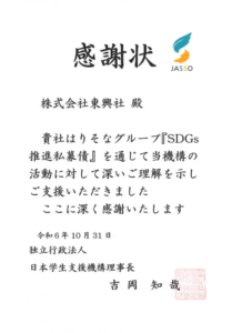 株式会社東興社は、この度、りそなグループのSDGs推進私募債を通じて、独立行政法人日本学生支援機構(JASSO)より感謝状を受領しました。